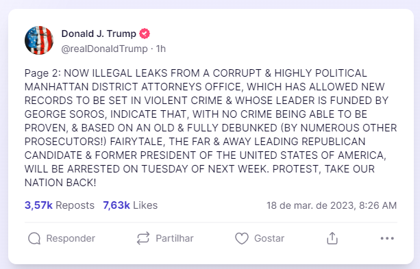 “AGORA VAZAMENTOS ILEGAIS DE UM CORRUPTO E ALTAMENTE POLÍTICO ESCRITÓRIO DE PROCURADORES DO DISTRITO DE MANHATTAN, QUE PERMITIU QUE NOVOS RECORDES SEJAM ESTABELECIDOS EM CRIMES VIOLENTOS E CUJO LÍDER É FINANCIADO POR GEORGE SOROS, INDICAM QUE, SEM CRIME PODER SER COMPROVADO, E COM BASE EM UM VELHO E TOTALMENTE DESMORALIZADO (POR VÁRIOS OUTROS PROMOTORES!) CONTO DE FADAS, O LÍDER CANDIDATO REPUBLICANO E EX-PRESIDENTE DOS ESTADOS UNIDOS DA AMÉRICA, SERÁ PRESO NA TERÇA-FEIRA DA PRÓXIMA SEMANA. PROTESTE, TOME NOSSA NAÇÃO DE VOLTA!”