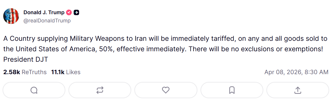 O presidente dos Estados Unidos, Donald Trump, anunciou nesta quarta-feira (8) uma nova ameaça econômica após recuar de novos ataque no Irã: os EUA vão impor tarifa de 50% a qualquer país que fornecer armas ao país persa. A medida, segundo o presidente estadunidense, valerá para “todos os produtos” vendidos ao mercado dos Estados Unidos por essas nações, sem exceções nem isenções.