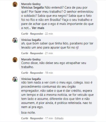 Eu respondi:”Não estou preocupado com o que cai bem pra um jornalista, acho mais grave o que não cai bem para um jornal (o desrespeito com os veículos de mídia independente), e que ele repete sempre. Ruim para o país, só queria mostrar essa prática reiterada acontecendo de novo. Obrigado.”