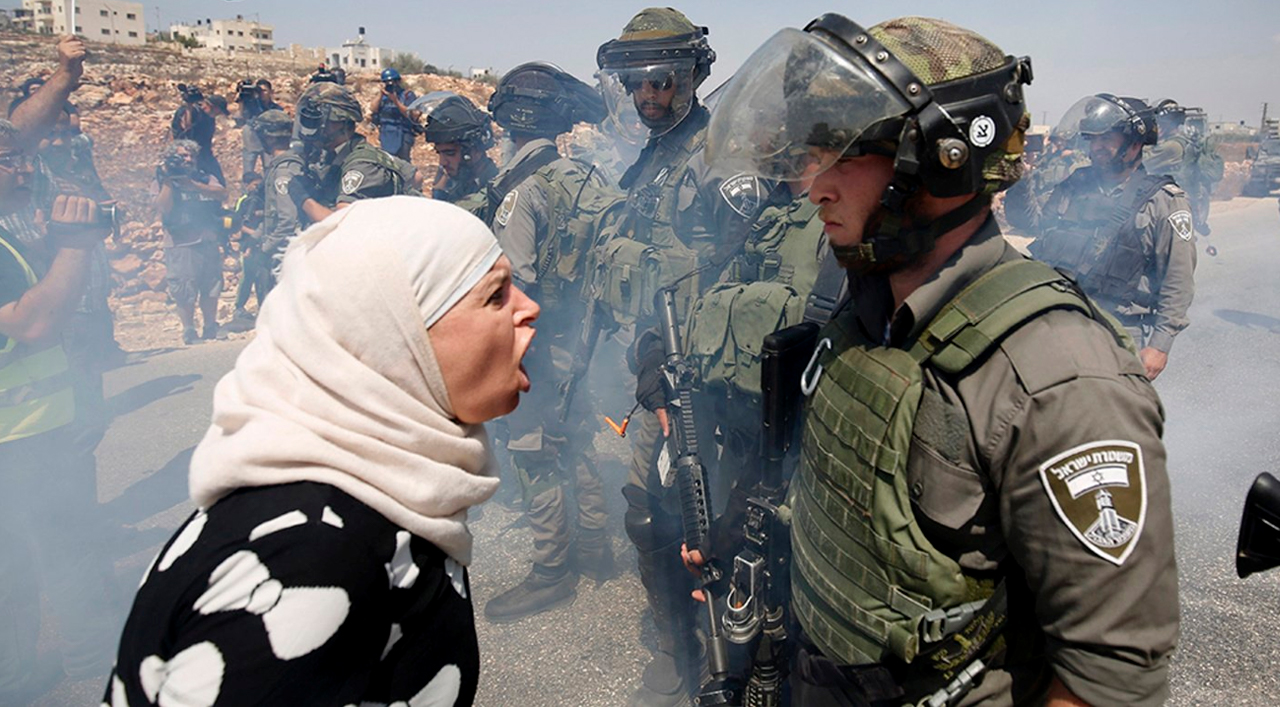 Mulher palestina enfrente soldado israelense