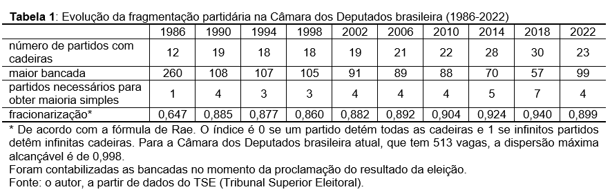 A reforma do sistema eleitoral, com a proibição das coligações e a vigência da cláusula de barreira, rendeu um efeito modesto, mas perceptível. Ao longo da Nova República, os indicadores de fragmentação partidária no Congresso mostraram tendência de piora, um processo que se acelerou a partir das eleições de 2014 – isto é, no momento em que o regime entra em crise. A eleição de 2022 revelou um quadro ainda de enorme fragmentação, mas de volta aos níveis de meados da década de 2000, como mostra a tabela 1.