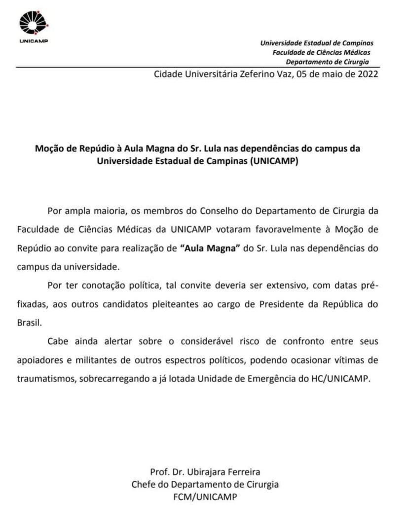 Uma moção de repúdio contra a aula magna do ex-presidente Luiz Inácio Lula da Silva (PT) na Universidade de Campinas (Unicamp) foi aprovada pelo Conselho do Departamento de Cirurgia da Faculdade de Ciências Médicas da instituição. O evento ocorreu na última quinta-feira (5), no Teatro de Arena da Unicamp, com a presença de milhares de pessoas.