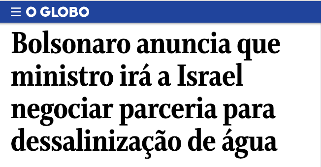 O Globo estampa em sua home: “Bolsonaro anuncia que ministro irá a Israel negociar parceria para dessalinização de água“.
