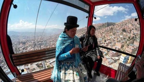Mas o mais espetacular são os teleféricos urbanos, de extraordinária tecnologia futurista, que mantêm, acima da cidade, um balé permanente de cabines coloridas, elegantes e etéreas como bolhas de sabão. Silenciosas e não poluentes. Duas linhas estão funcionando agora, a vermelha e a amarela; uma terceira, a verde, será inaugurada nas próximas semanas, permitindo assim a criação de uma rede interligada de transporte a cabo de 11 km, a maior do mundo. Isso possibilitará a dezenas de milhares de moradores de La Paz economizar em média duas horas de viagem por dia.