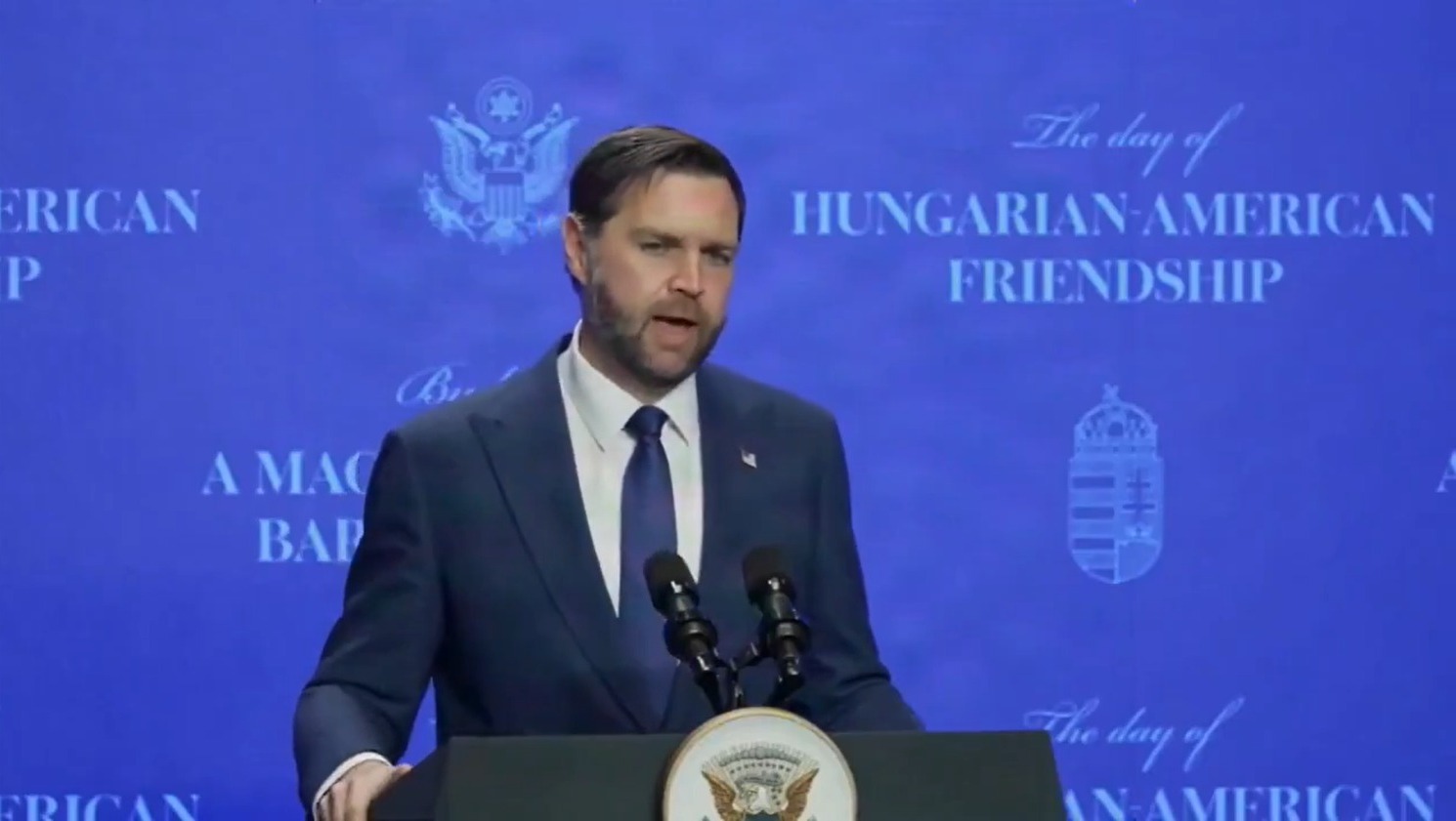 O vice-presidente dos EUA, JD Vance, durante discurso em Budapeste, na Hungria, nesta terça (7). Foto: Reprodução