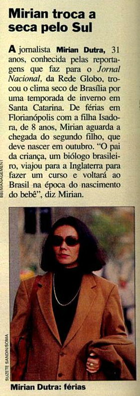 Uma nota na seção Gente relatava que Miriam Dutra, então amante de FHC, “conhecida pelas reportagens para o Jornal Nacional”, havia trocado “o clima seco de Brasília por uma temporada de inverno em Santa Catarina” (veja abaixo).