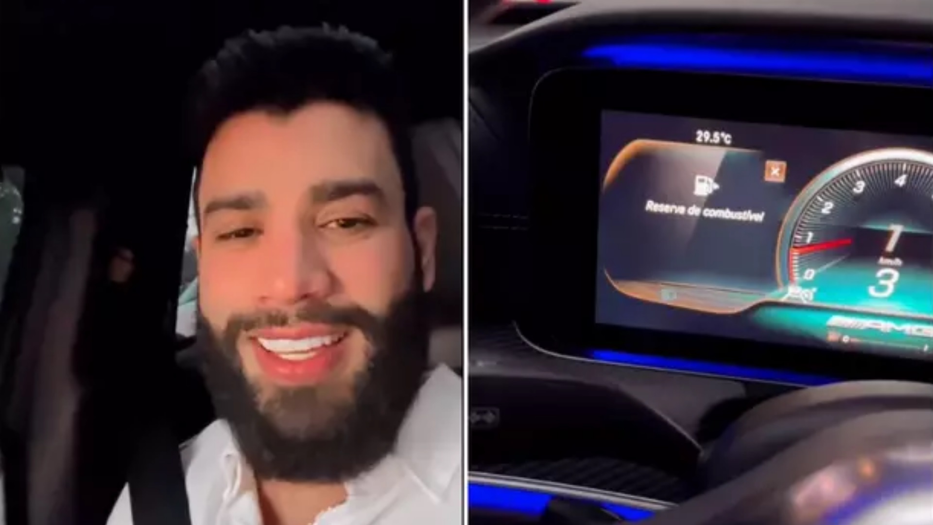 Gusttavo filmou o painel do carro mostrando o alerta de combustível na reserva e disse: “Acontece só comigo ou acontece com vocês também? Minha gasolina está para acabar, está só o fio da rabiola e eu no meio desse trânsito. Imagina se acaba?”.