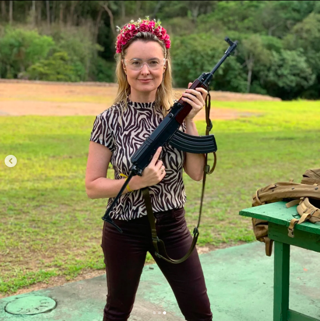 Em uma de suas publicações, ela defende “femininas e armamentistas”, e aparece em um compilado de vídeos em clubes de tiros. “Tiara na cabeça, fuzil na mão e Deus, Pátria, Família no coração. Lugar de mulher é onde ela quiser e o meu é ao lado do Bolsonaro, SIM!”.