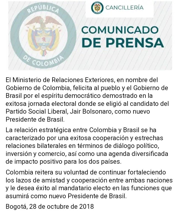 “O Ministério das Relações Exteriores, em nome do governo da Colômbia, rejeita e nega as versões que foram publicadas hoje pelo jornal Folha de S.Paulo sobre uma suposta e inexistente sugestão da Colômbia ao presidente eleito do Brasil, Jair Bolsonaro, para derrubar o governo de Nicolás Maduro através de uma intervenção militar.