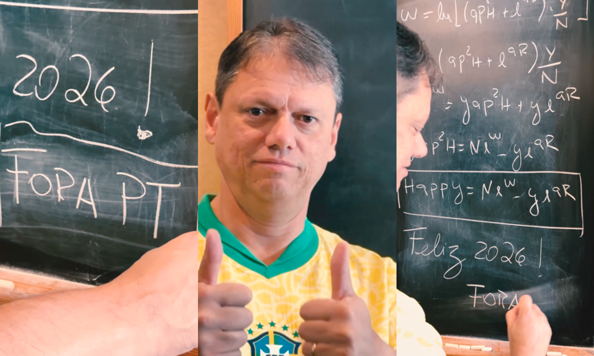 Em um vídeo publicado na última quinta-feira (1°), Tarcísio aparece vestindo uma camiseta da seleção brasileira e simulando a resolução de uma equação matemática. O resultado escrito na lousa faz referência à virada do ano, mas termina com um slogan político. “A fórmula é simples! Feliz 2026 = Fora PT”, escreveu o governador na legenda da publicação, que rapidamente viralizou.