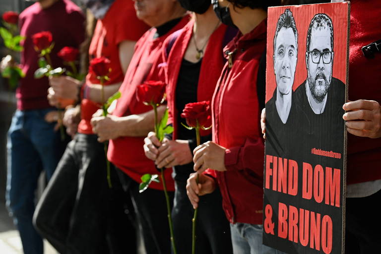 Ao lado da Embaixada do Brasil em Londres, manifestantes se reuniram para fazer uma vigília pedindo respostas sobre o desaparecimento do jornalista britânico Dom Phillips e do indigenista Bruno Pereira. Os dois estão desaparecidos desde o último domingo (5), tendo sido vistos pela última vez no Vale do Javari (AM).