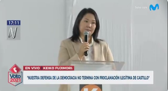 ?? Keiko Fujimori anuncia que vai reconhecer os resultados da eleição peruana “porque é o que a lei e a Constituição determinam”.