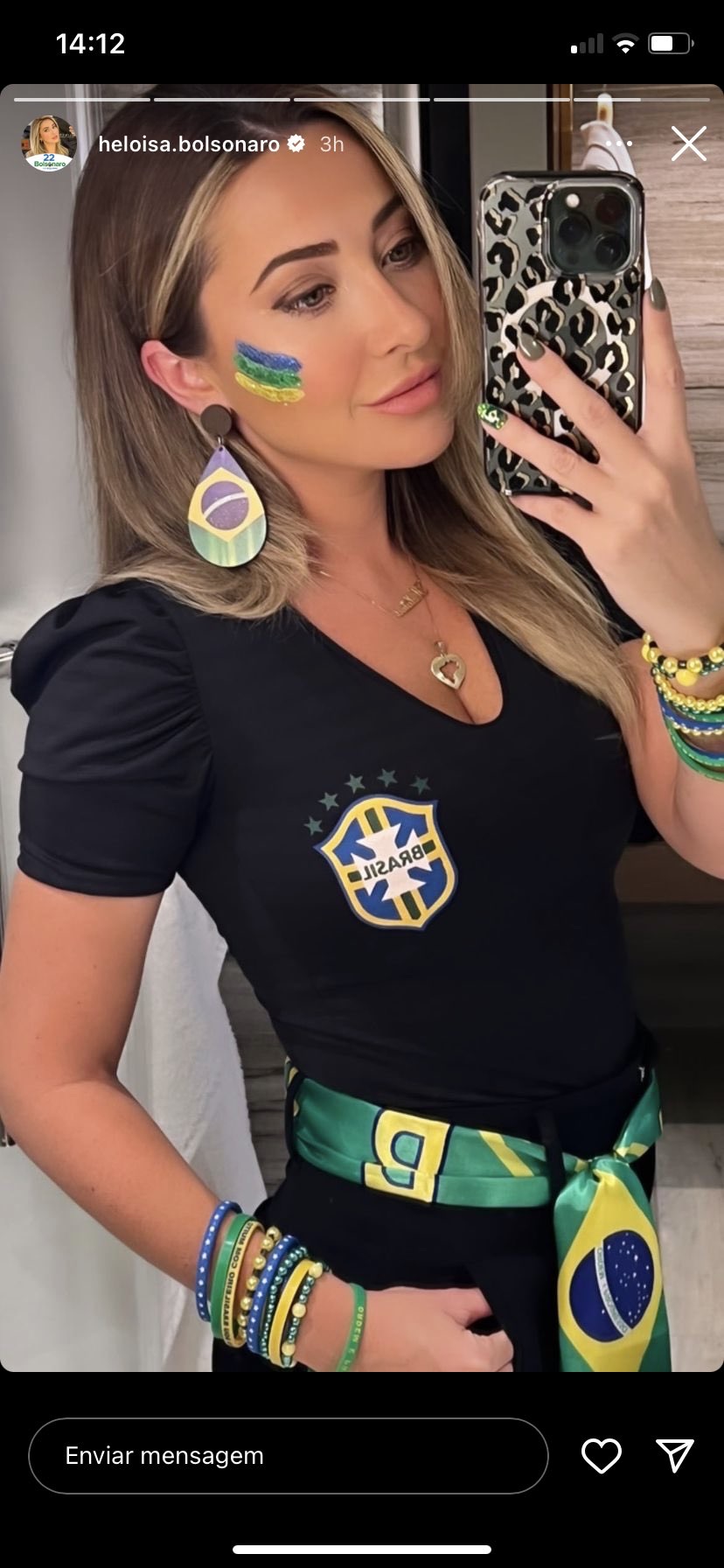 Está tentando manter a viagem na surdina, mas a mulher dele, Heloísa, não se aguentou e posou fofa vestida com as cores da seleção no estilo blogueirinha miliciana de moda.