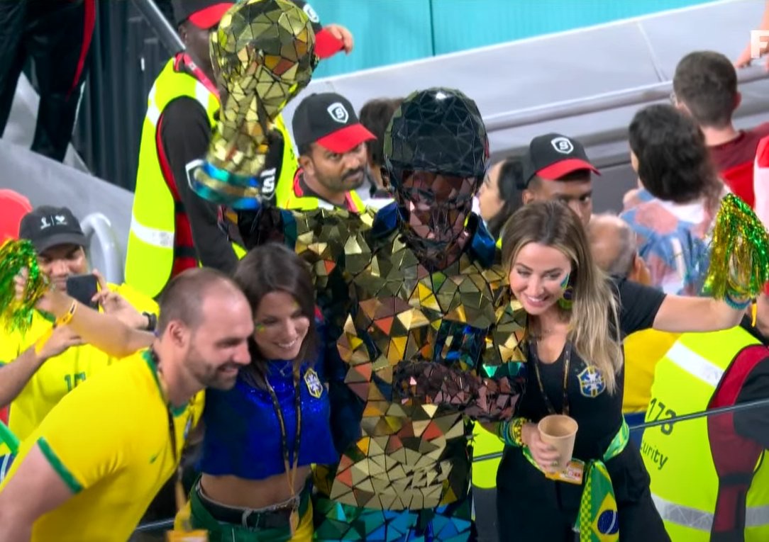Eduardo apareceu posando para uma foto com um sujeito fantasiado de troféu no estádio 974, onde o Brasil derrotou a Suíça.