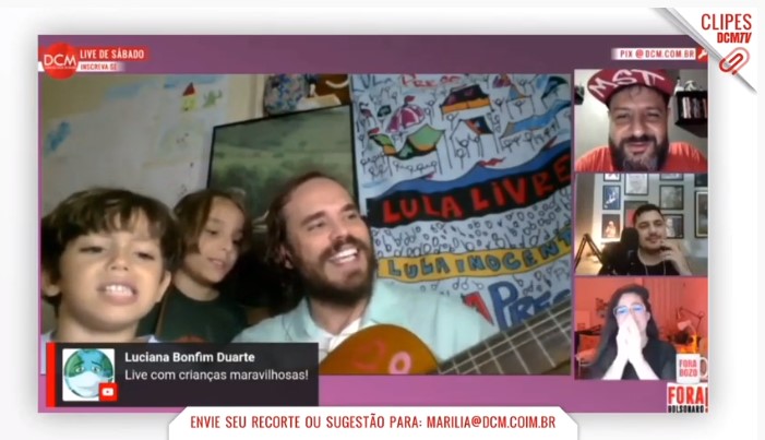 Em participação na Super Live do DCM neste domingo (25), o cartunista Daniel Pxeira, João e Tito cantaram “É o Brasil feliz de novo”.