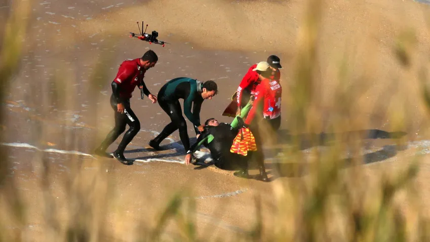 As imagens registram Burle desaparecendo sob a massa d’água e, segundos depois, sendo lançado para longe da área segura. A força das ondas obrigou a equipe de segurança a uma intervenção rápida.