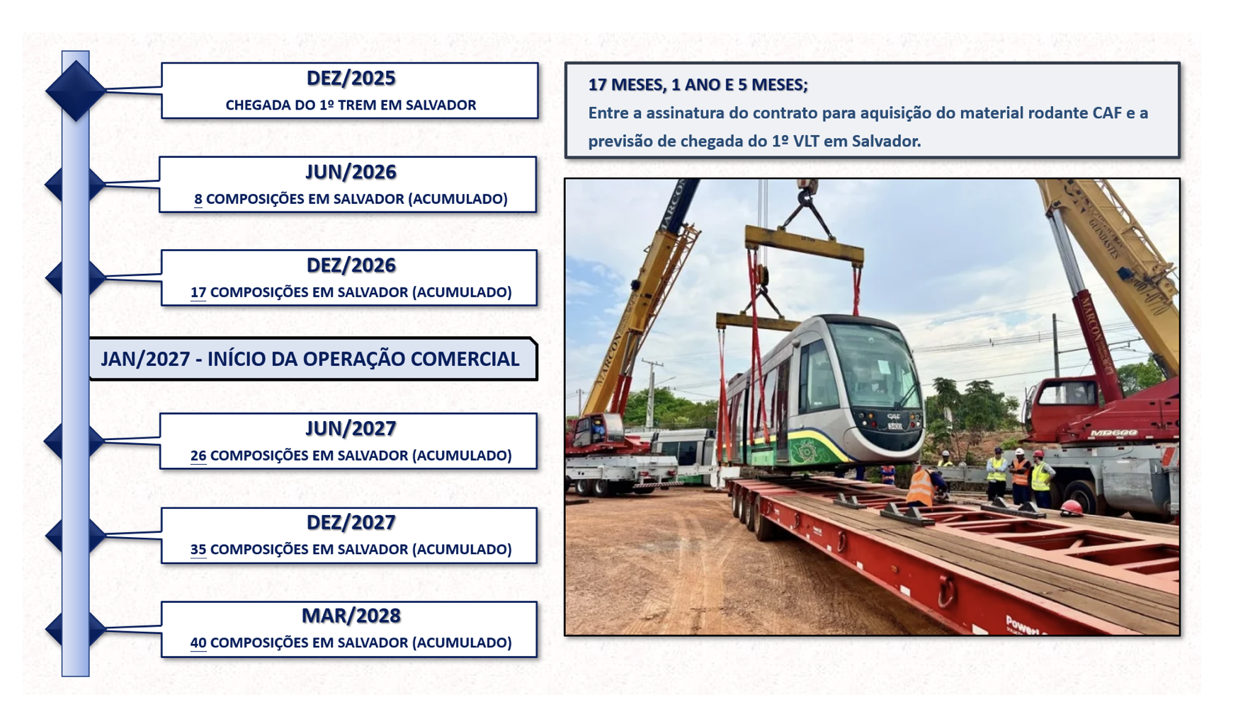 Os trens que vão operar no VLT são uma atração à parte. Em julho de 2024, foram adquiridos 40 trens novinhos em folha, que estão sendo montados em Hortolândia-SP. O primeiro trem deve chegar em Salvador em dezembro de 2025. E mais: esses trens terão vagões adaptados para carregar pescados, atendendo marisqueiros e pescadores das comunidades locais, gerando mais integração entre o transporte e a economia da cidade.