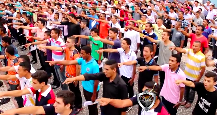Em vídeos divulgados pela instituição, dezenas de jovens uniformizados aparecem marchando triunfais e repetindo as palavras de ordem de um pastor paramentado como rabino.