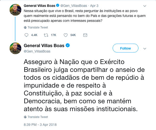 O general Eduardo Villas Bôas, comandante do Exército, explicou seu tuíte na véspera do julgamento de Lula pelo STF em entrevista à Folha de S.Paulo.
