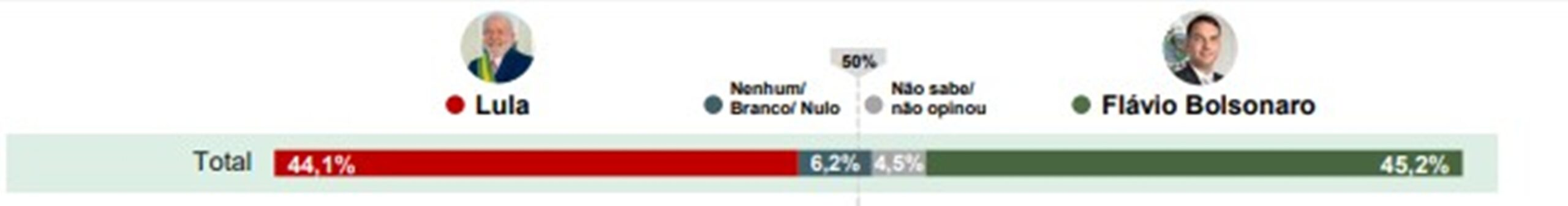 Já no cenário de segundo turno entre Lula e Flávio Bolsonaro, o senador aparece numericamente à frente, com 45,2% das intenções de voto, contra 44,1% do atual presidente.