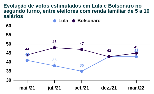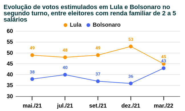 É exatamente junto a esse extrato, de eleitores com renda familiar até 2 salários, que Lula vem mantendo a maior vantagem sobre Bolsonaro. No histórico das últimas cinco pesquisas do Datafolha, o petista fica mais de 40 pontos à frente do capitão. Nessa última pesquisa, o placar foi de 65% a 25%.