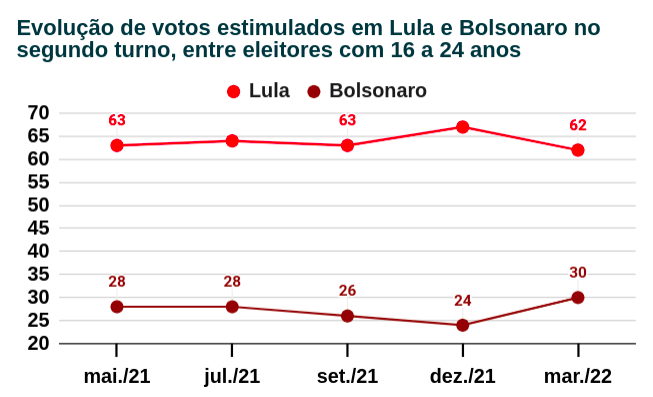 Outro segmento onde Lula tem um desempenho impressionante é a juventude. Entre eleitores com idade entre 16 e 24 anos, que representam 17% do eleitorado nacional, Lula vem mantendo uma vantagem superior a 30 pontos desde o ano passado, nas simulações de segundo turno com Bolsonaro.