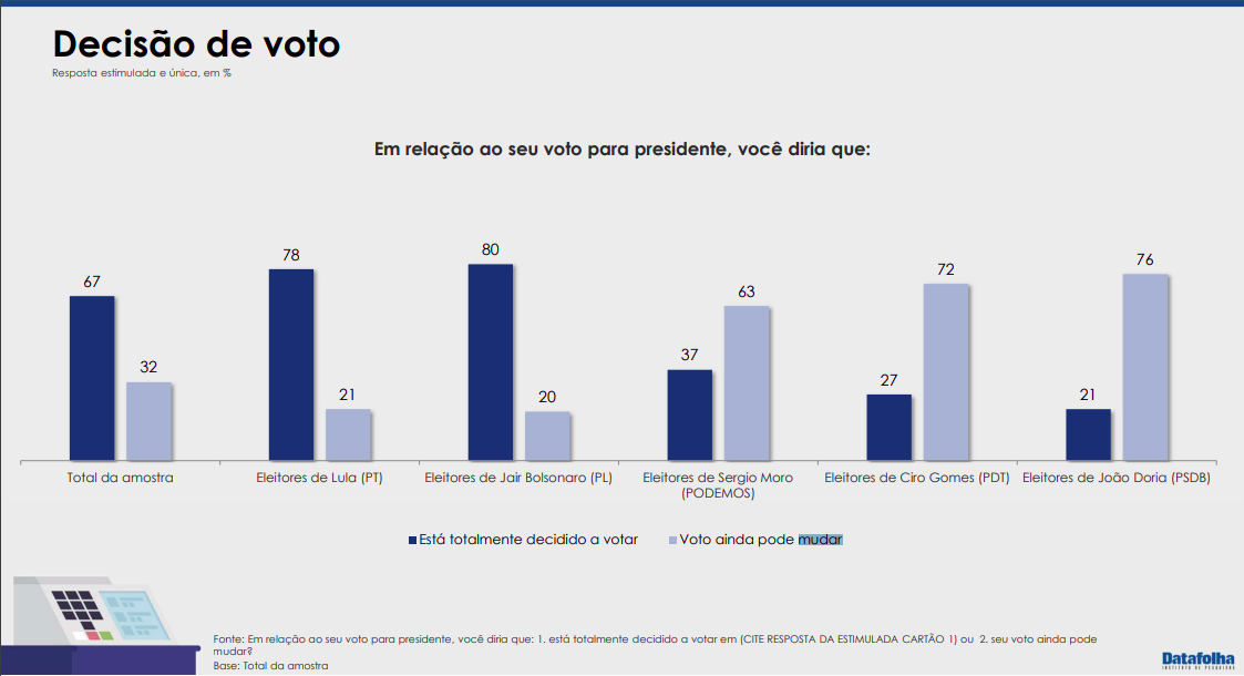 Como o ex-presidente é uma liderança muito conhecida (segundo o Datafolha, 99% o conhecem), esse voto em Lula é bastante consolidado.