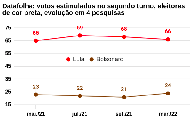 Continuemos. Outro segmento que chama atenção pelo lulismo é o eleitor de cor preta. Segundo o Datafolha, Lula vem mantendo uma distância de mais de 40 pontos sobre Bolsonaro nesse extrato da sociedade brasileira, nas simulações de segundo turno. Na pesquisa de março, Lula pontuou 66%, contra 24% de Bolsonaro, entre eleitores pretos.