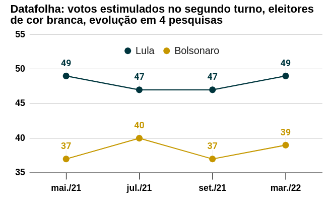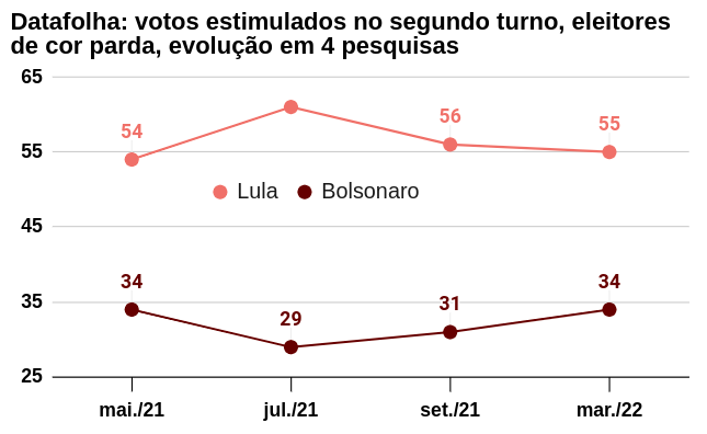 Entre pardos, Lula vem mantendo uma vantagem de 20 pontos desde a primeira pesquisa da série do Datafolha. Hoje tem 55% contra 34% de Bolsonaro, neste segmento.