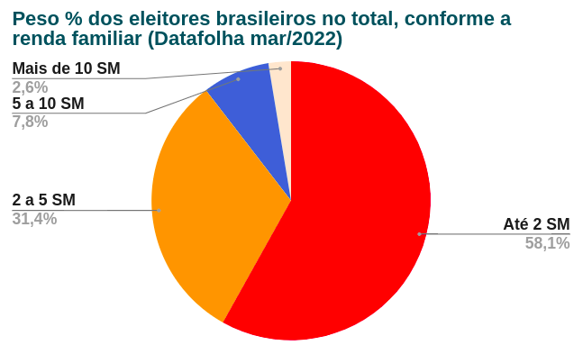 O segmento da sociedade com renda familiar entre 5 e 10 salários corresponde a 8% do eleitorado e os que recebem acima de 10 salários, a apenas 2,6%. Entretanto, estes setores costumam ser muito influentes em momento de campanha política, então é preciso prestar atenção neles.