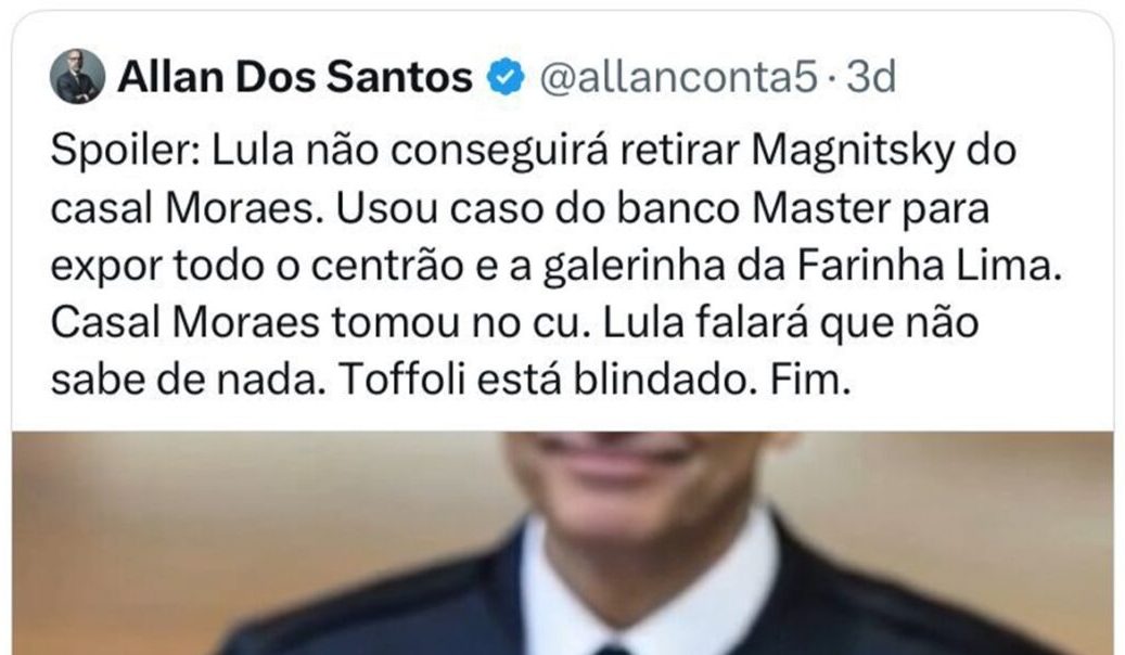 O conflito foi desencadeado por uma publicação feita por Allan dos Santos sobre a permanência das punições previstas na Lei Magnitsky. O influenciador apagou o conteúdo, mas Nikolas recuperou o print e o enviou a um grupo de parlamentares. Em seguida, Allan questionou publicamente a atitude do deputado e escreveu: “Por que enviar meu tuíte no grupo do WhatsApp dos deputados, Nikolas? Quer entrar ao vivo para discutir o assunto?”.