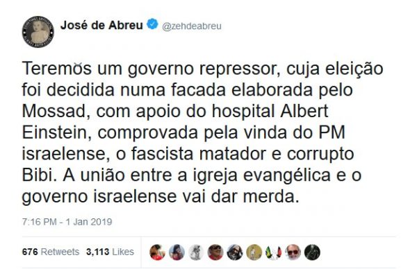 Depois de perder o caso na Justiça, Zé de Abreu usou seu perfil do Twitter nesta sexta-feira (15) para comunicar que estava deixando o Twitter. Em 2018, o ator acusou o Hospital Israelita Albert Einstein de “arquitetar”, em parceria com Israel, a facada contra o presidente Jair Bolsonaro (PL), sendo condenado em 2019. O artista recorreu, mas a primeira turma do Supremo Tribunal Federal (STF), por unanimidade, resolver manter a condenação.